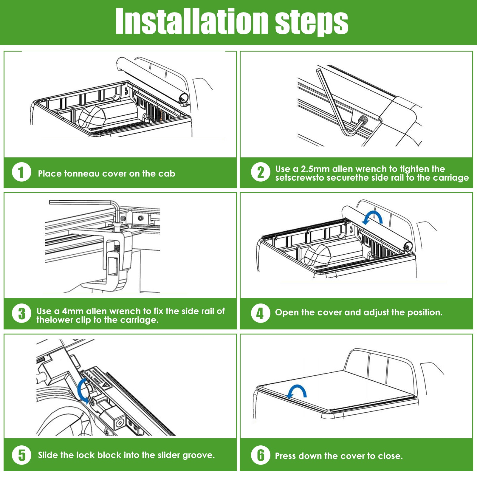 Package Include: 1*Pair of Side Mounting Rails,1*Tonneau Cover body,1*manual,Hardware as shown,6*Buckle,1*Sponge,6*Sponge Stickers,1*wrench